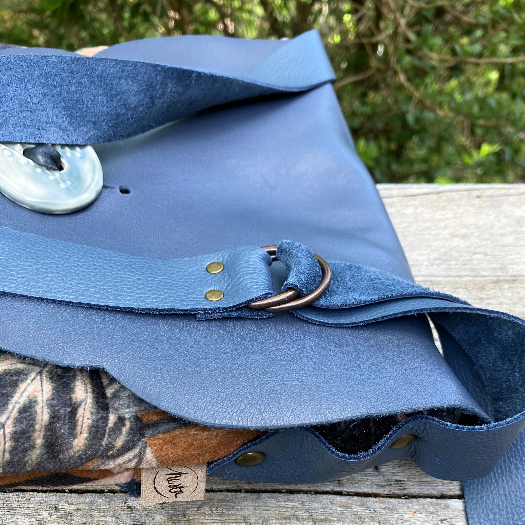 Soft floral velveteen furnishing fabric satchel, soft medium weight leather flap with ceramic button closure. Zippered pocket on the back.