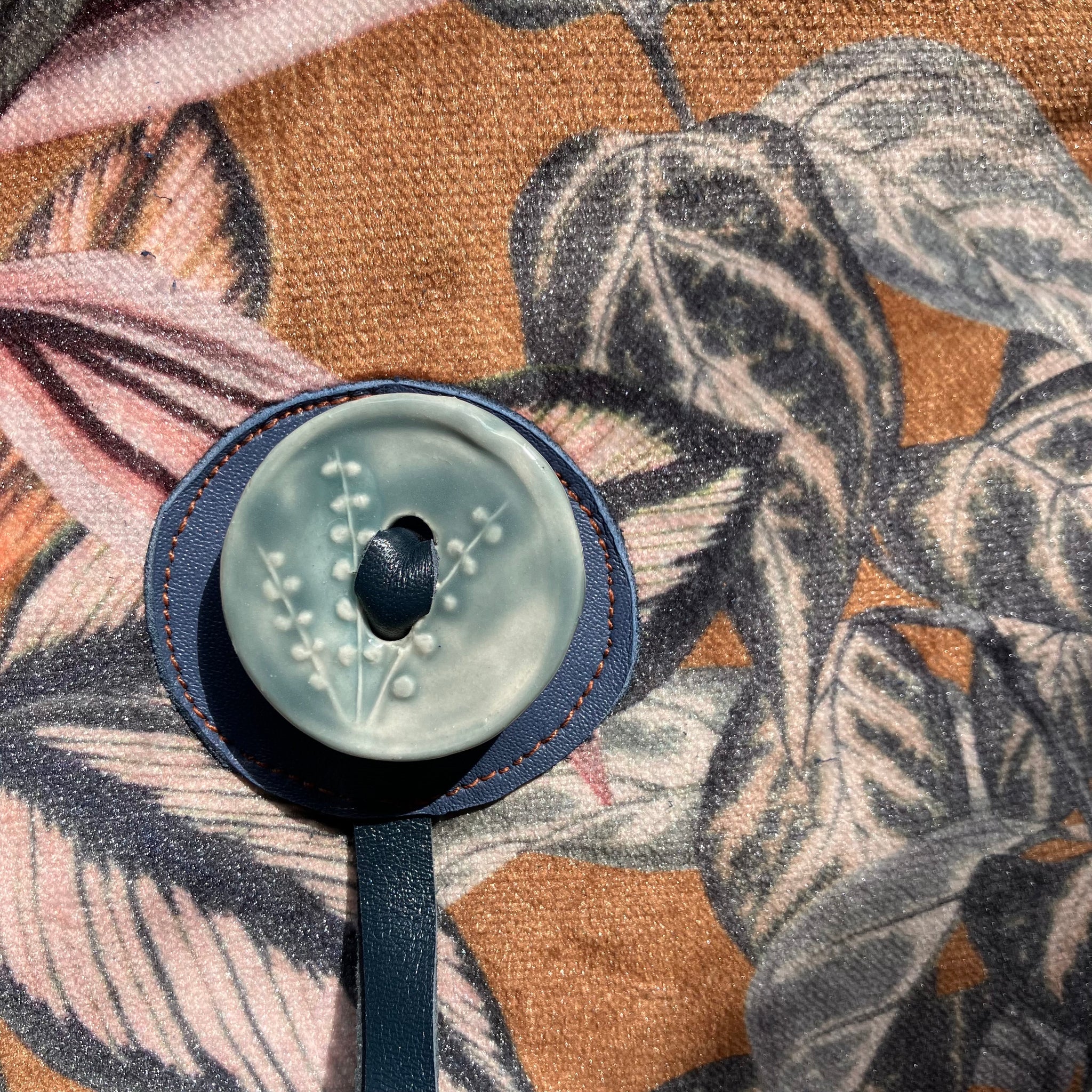 Every bag is an individual creation, no two are the same. Each one features handmade ceramic beads and leather leaves.