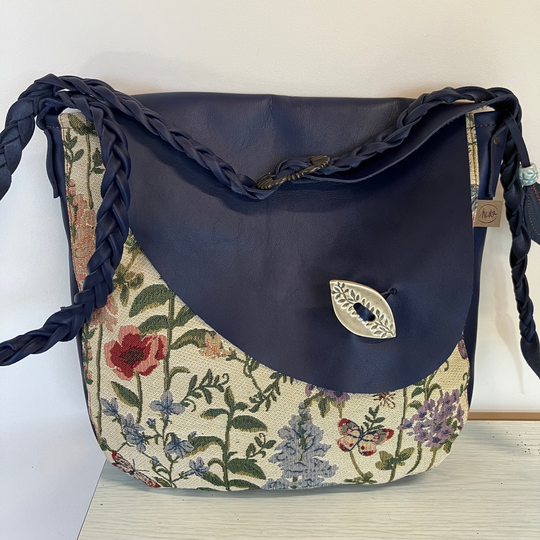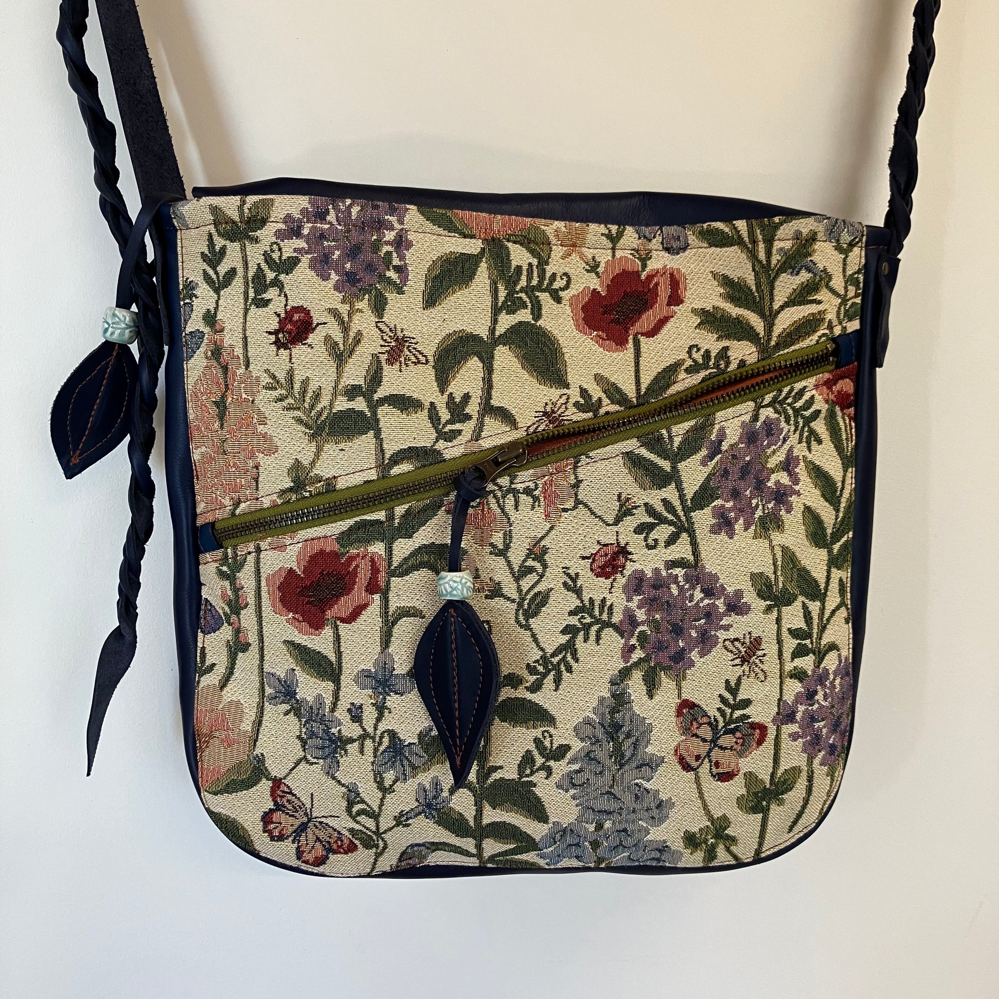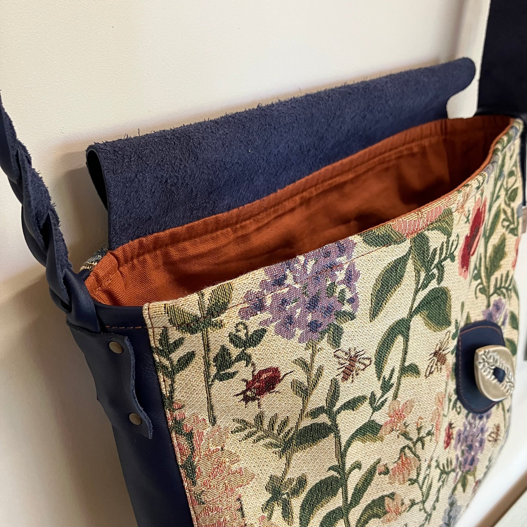 Wildflower and insect print furnishing fabric main body front with soft, medium weight leather flap, gusset and plaited strap. Strap approximately 135cm at its longest, adjustable with metal buckle.